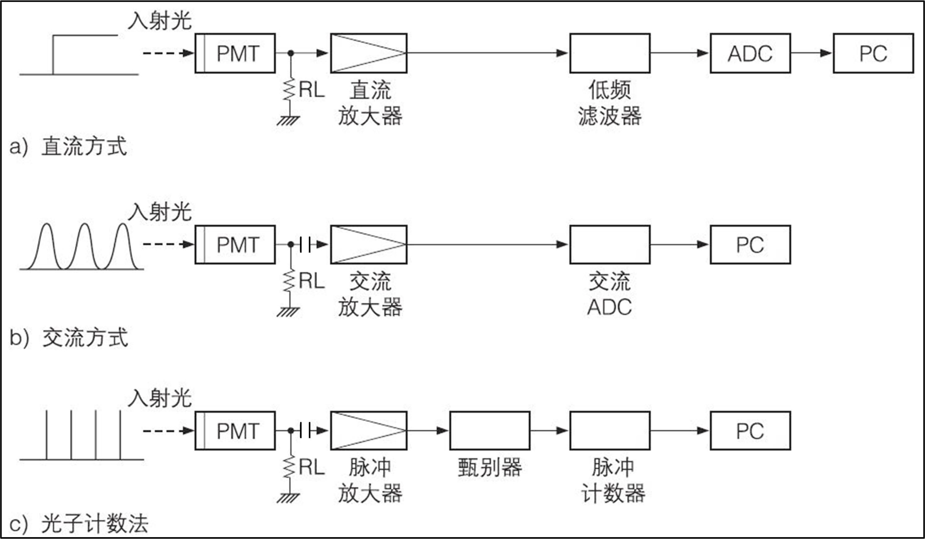 PMT連接分壓器和高壓便可從陽輸出電流信號,后續(xù)連接回路的設計根據入射光強的不同而有所區(qū)別,如圖5所示,其中a)直流方式,是將PMT的直流成分分別通過放大器、低通濾波器之后再進行檢測,該方法適用于探測光強相對較強的情況,且使用較為廣泛;b)交流方式,是將PMT的輸出通過電容器取其交流成分,再用平方檢波器將其變成直流成分進行檢測,該方法一般適用于光強較弱的情況,在此情況下,輸出信號中的交流成分壓制了直流成分而占主導地位;c)光子計數方式,是將PMT的輸出脈沖先放大,再經過脈沖幅度甄別器進行選擇,然后對幅度在某一甄別電壓之上的脈沖進行計數,該方法適用于觀察從PMT輸出的脈沖是離散的情況,因此其在微弱光探測領域即單光子領域是一種非常有效的方法。