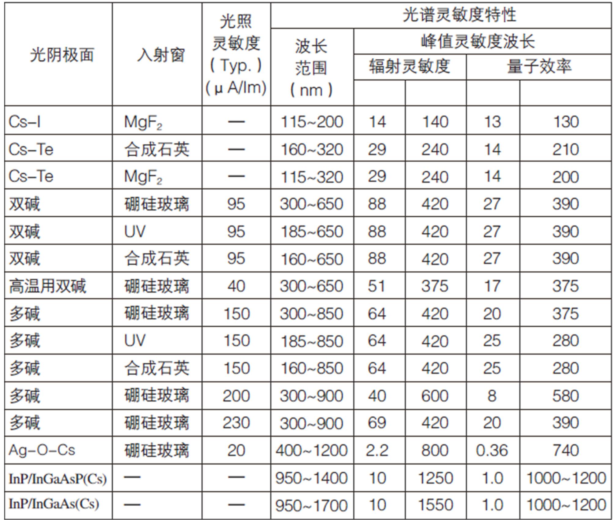 圖1 常見PMT響應范圍
