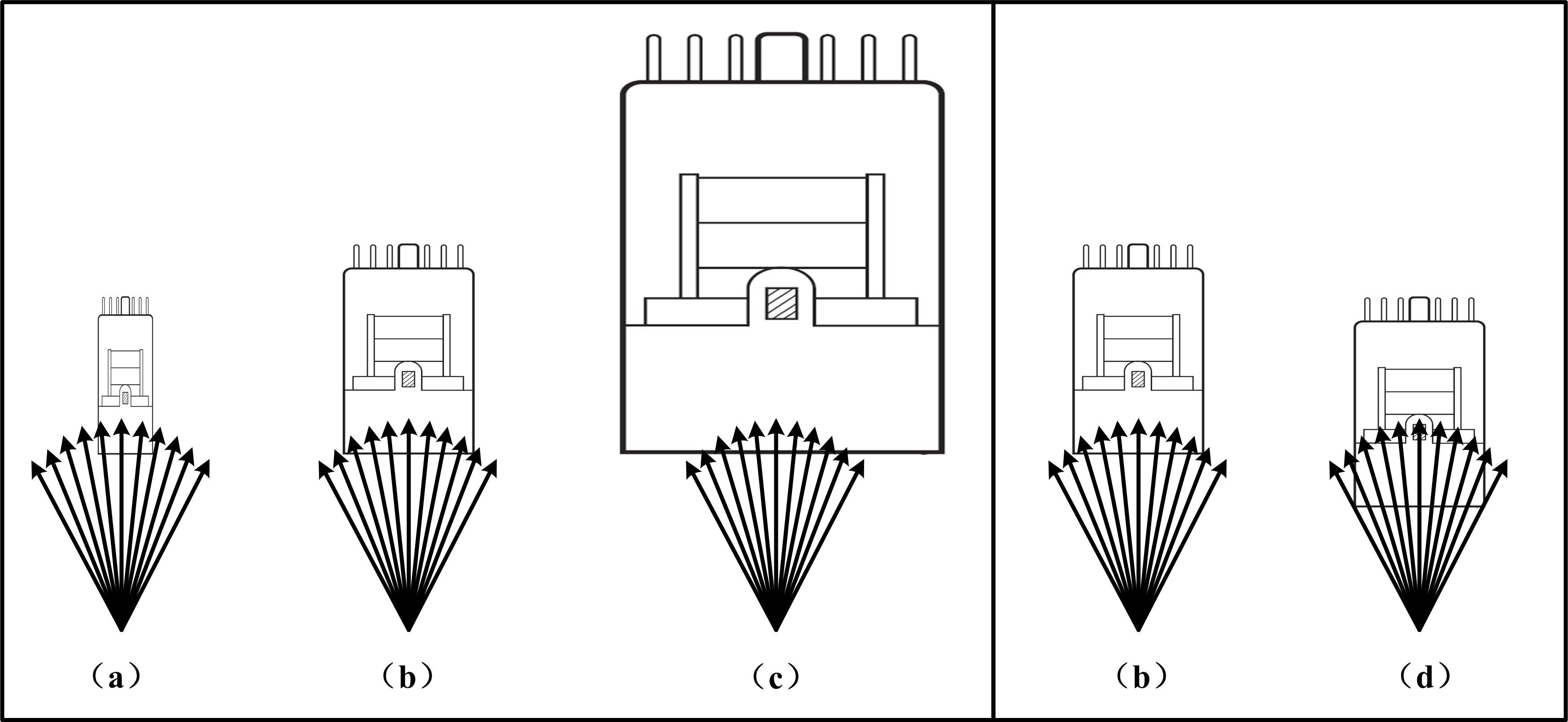 根據入射光的光斑形狀、大小、與PMT的距離關系等選擇合適的PMT。如狹縫形的光斑更適合用側窗型PMT。陰面大小選擇以盡量多的收集光束為原則,如圖2所示,在光源特性完全一致的情況下,(a)PMT陰面尺寸略小,不能有效收集光信號;(c)光信號雖可全部入射到PMT上,但光斑相對陰面尺寸過小,陰面邊緣部分沒有有效信號,卻會產生噪聲,使信噪比下降;(b)尺寸的選擇明顯優(yōu)于(a)和(c);(d)相比(b)而言,減小光源與PMT之間的距離,可提高光信號的收集效率、增大PMT的探測效率,是PMT的方案。