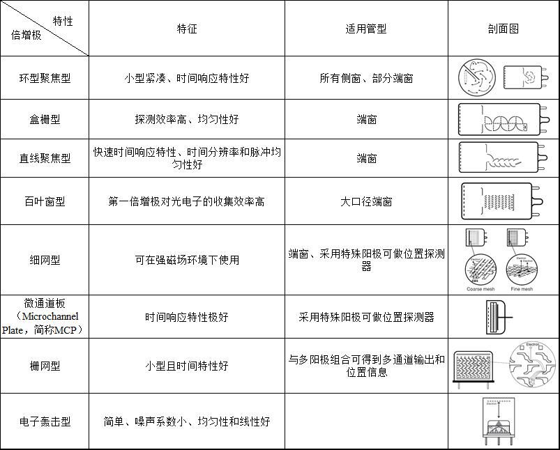倍增有許多種類,由于其結構、倍增的級數的不同而使得電流增益、時間響應特性、均勻性、二次電子收集效率特性等不同,要根據使用目的做相應的選擇。各倍增種類如表3所示。