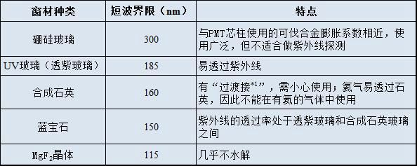 表1 PMT常用窗材種類