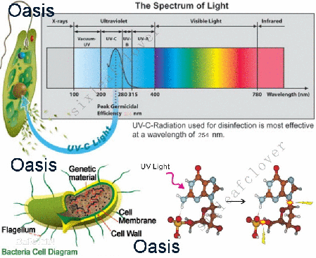 波長在240~280nm范圍內的紫外線可以破壞細菌病毒DNA(脫氧核糖核酸)或RNA(核糖核酸)的分子結構,造成生長性細胞死亡和(或)再生性細胞死亡,達到滅菌消毒的效果。尤其是波長為254nm的紫外線,滅菌消毒的效果強且不會產生臭氧造成二次污染。有待于進一步發展和研究。