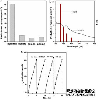 其中,BCN-MPB為納米片,這與其他三種產物不同(BCN-MB、BCN-BA、BCN-BO)。與塊體BCN相比,BCN-MPB具有更大的比表面積、更長的光生載流子壽命和更強的電子輸運能力。因此,其在可見光輻射下具有增強的光催化產氫性能。